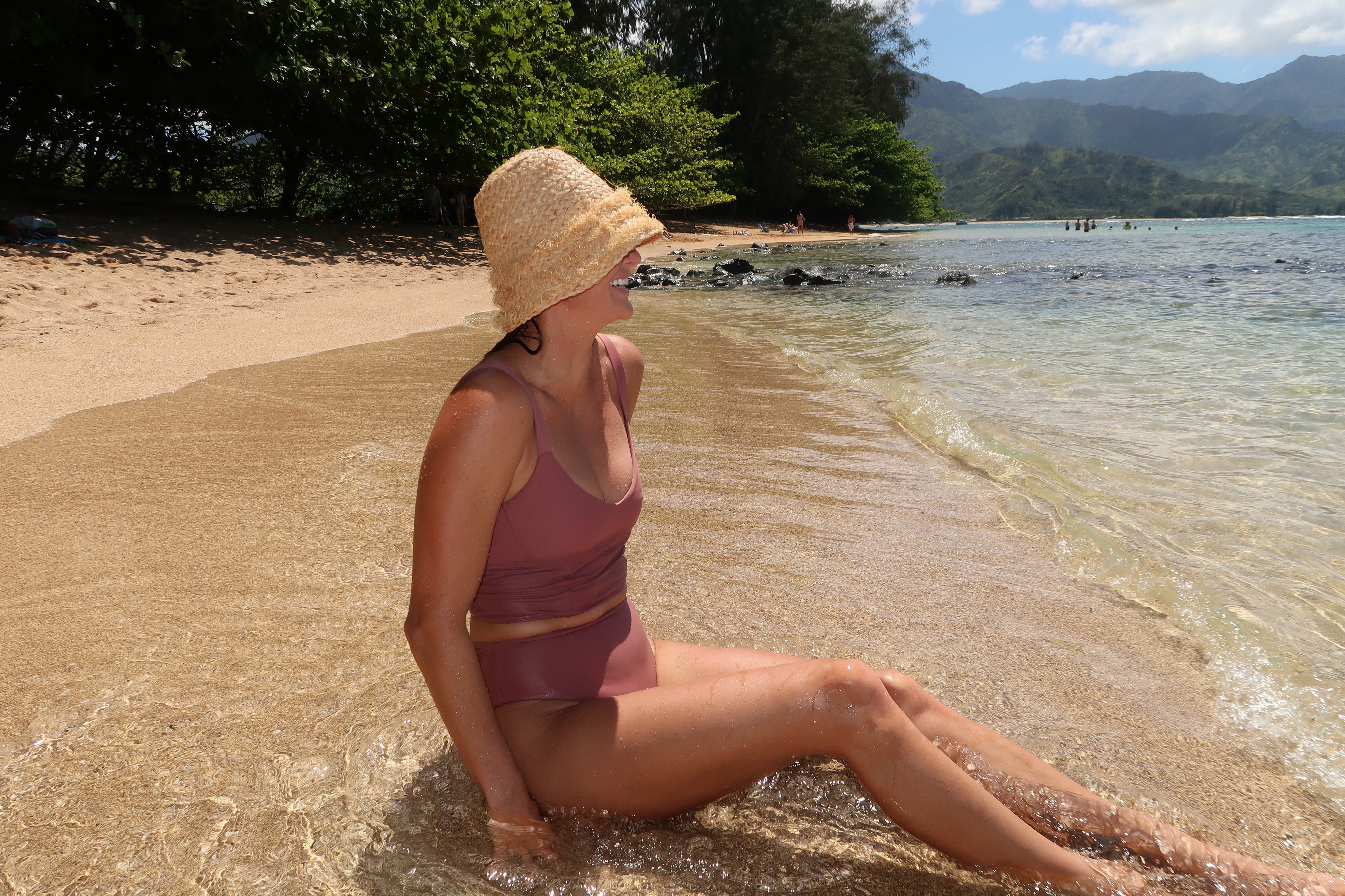Model is 5’8” with a 36C bust, 28” waist, and 39” hip, wearing a size medium Lisa Top and large Tati Bottoms.